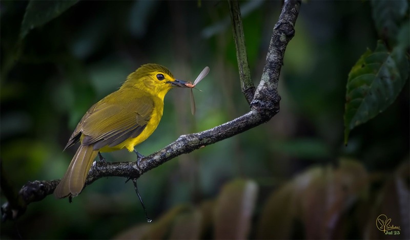 The Yellow-browed Bulbul (Iole indica) is a species of bulbul found in the forests of southern India and Sri Lanka. It is mainly yellow on the underside and olive above with a distinct yellow brow. They are easily located by their loud calls but tend to skulk within foliage below the forest canopy. (Source: Wiki)