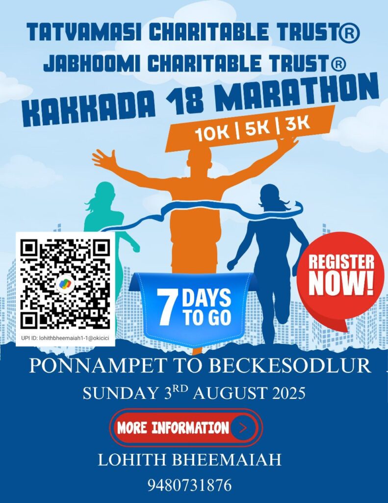 The Tattvamasi Charitable Trust, in association with Jabhoomi Charitable Trust, has announced the Kakkada 18 Marathon 2025, set to take place on August 3 in Ponnampet.