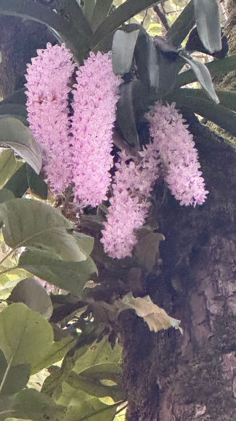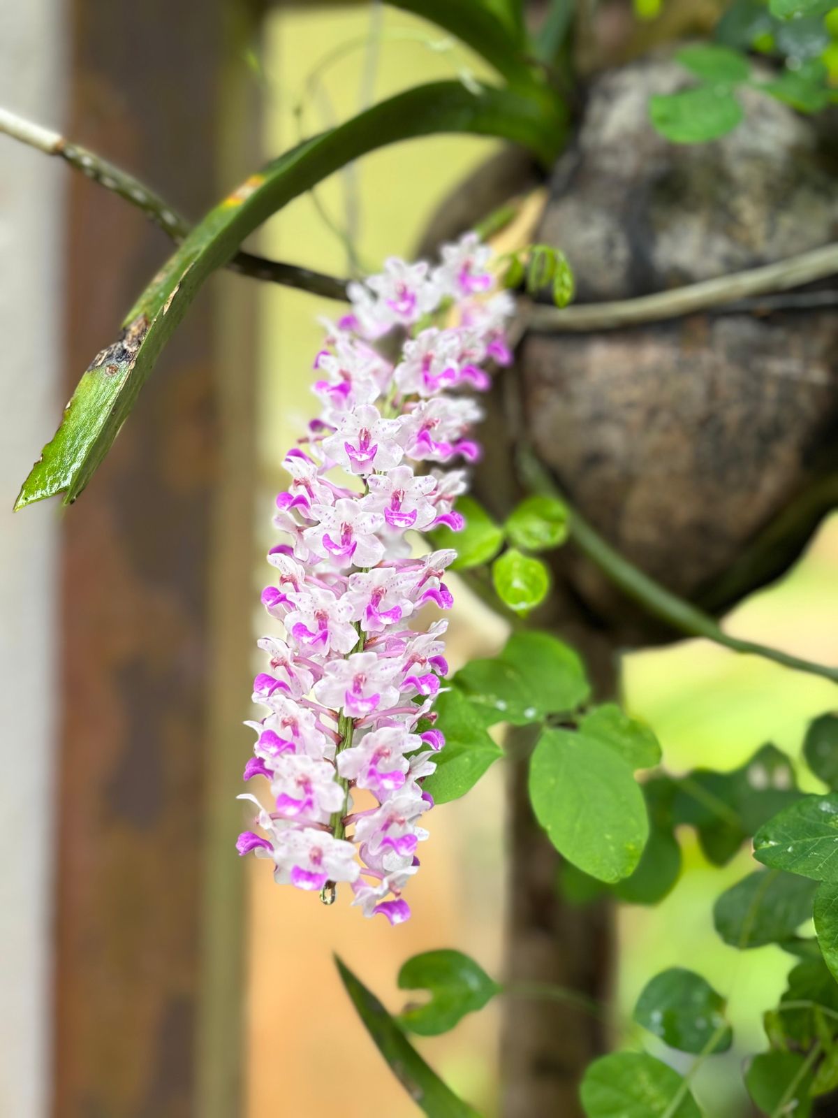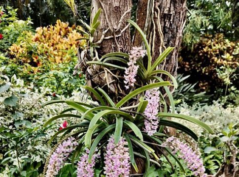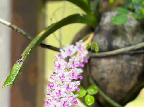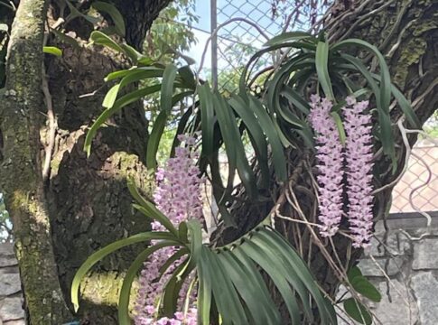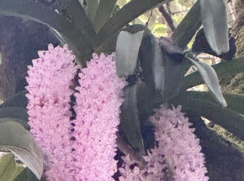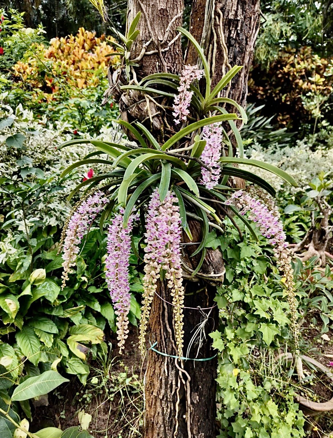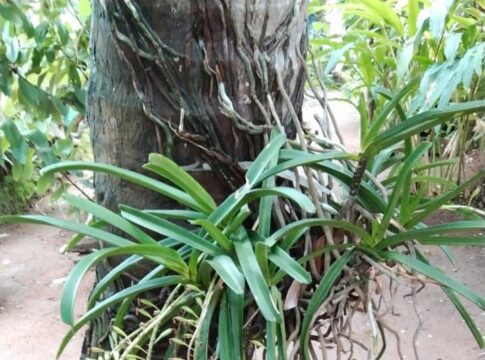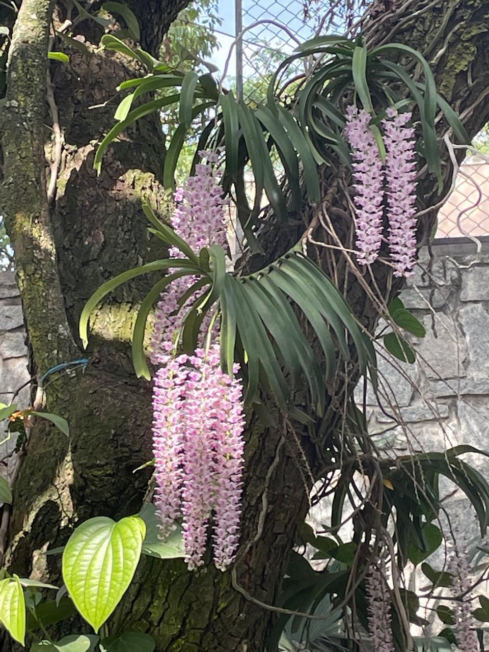 2. In Kodava Thakk the Foxtail orchid is called “Seethe Pu”. We have one luxuriously growing on the stem of the coconut tree 🌴, which I brought from my coffee estate 35 years ago and tied it to the coconut tree in the picture. It is a parasite, and it blooms every year in April end and the flowers remain till end of May.