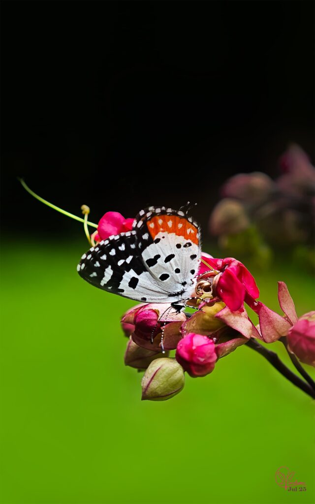 The Red Pierrot (Talicada nyseus), is a small yet striking butterfly belonging to the family Lycaenidae often found fluttering around gardens, edges of forests, and open woodlands. It is renowned for its vibrant coloration and delicate beauty.