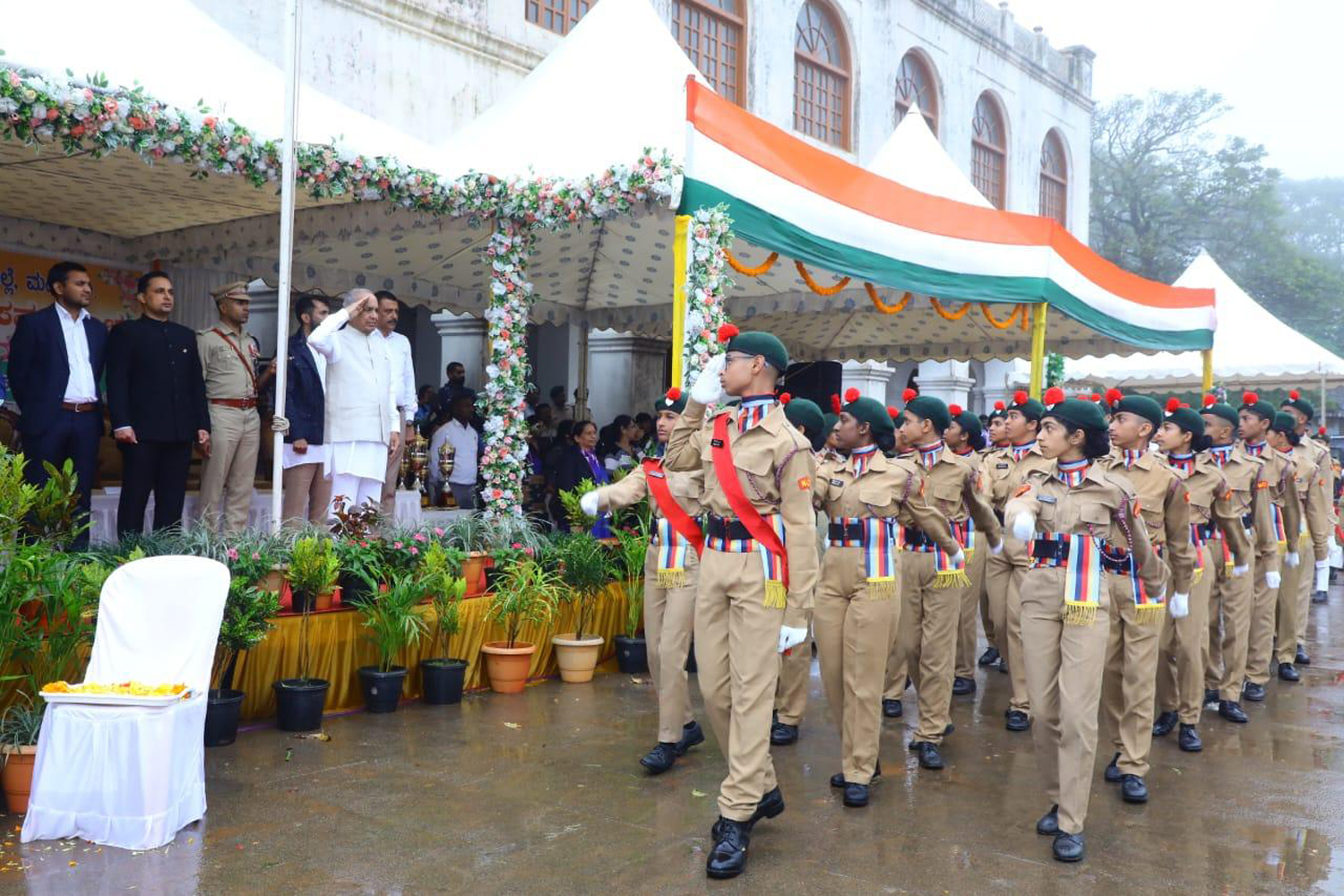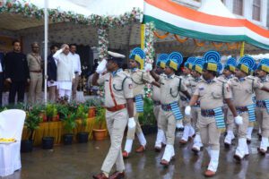 The 79th Independence Day celebrations organized by the Kodagu District Administration were held meaningfully in the premises of Madikeri Fort amidst rain. Kodagu District In-charge Minister N. S. Bhosaraju hoisted the National Flag. After hoisting the flag, the District In-charge Minister witnessed a grand spectacular march past by 23 contingents under the leadership of Reserve Police Sub-Inspector Hanamanth Koujolgi. The contingents included students from various schools and colleges. Students from seven schools presented patriotic skits and dances. A large number of spectators, holding umbrellas, watched the performances of the children and supported them wholeheartedly.