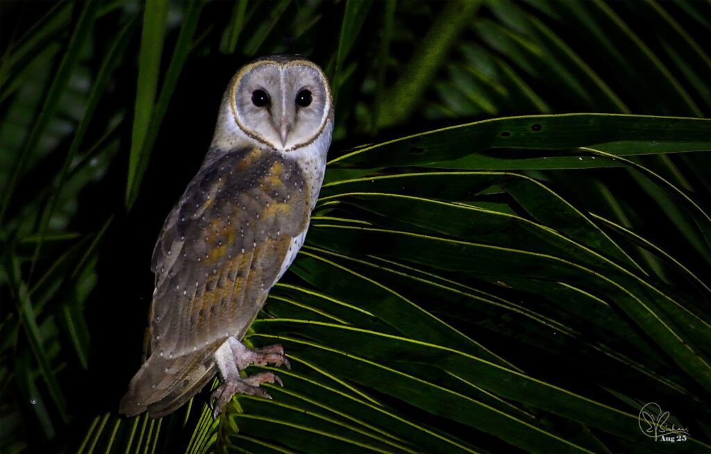 Medium-sized owl with a heart-shaped facial disc and deep dark eyes. With varied white-and-black speckling on the upperparts, beautiful gray-and-tawny wings, and large round head with ghostly white facial disc.