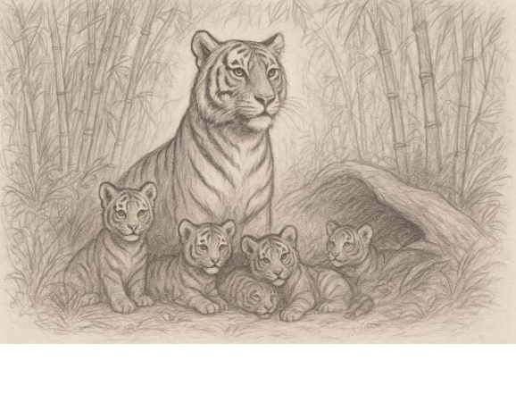 Taru was the undisputed queen of her forest. But beyond the stripes and strength, she was also a mother, watchful, tender and fiercely protective of her little brood. Each cub carried a spark of life that made them unique: Chitru, bold and headstrong; Mala, forever curious; Piku, playful and restless; and the inseparable twins, Rani and Raja, always tumbling about together like shadows in a mirror.