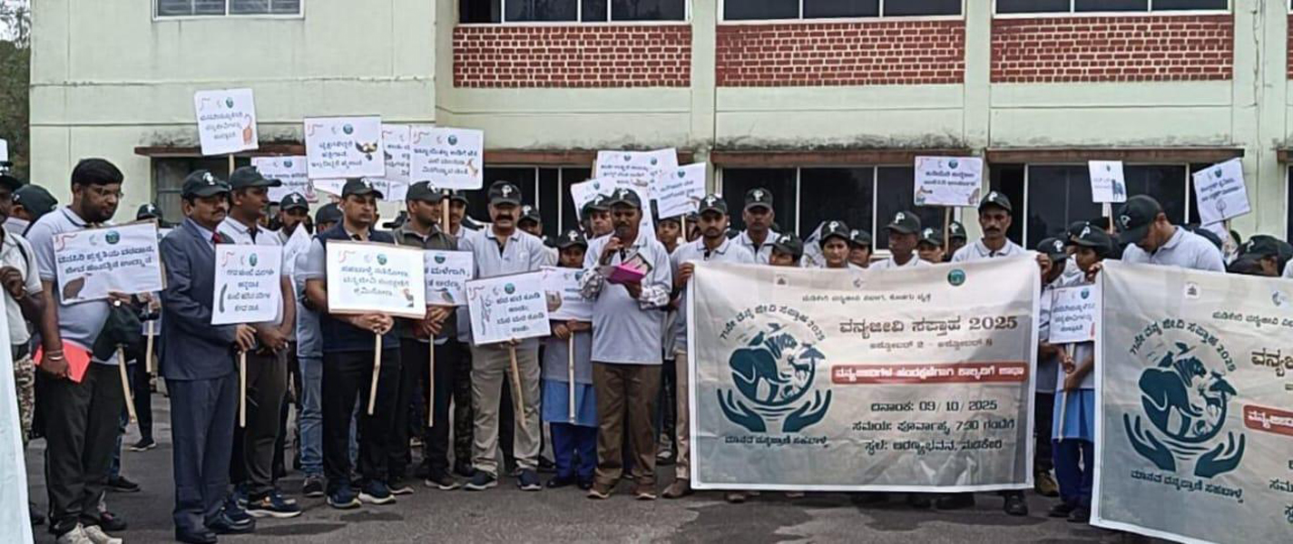 The rally began from the Madikeri Forest Office and concluded at Salumarada Thimmakka Park, covering a 4 km route via General Thimmaiah Circle, Town Hall, and Mahadevpet. Students from various schools, NSS units, and the Eco Club of Kudumangaluru Government High School participated, carrying placards with slogans promoting forest and wildlife conservation.