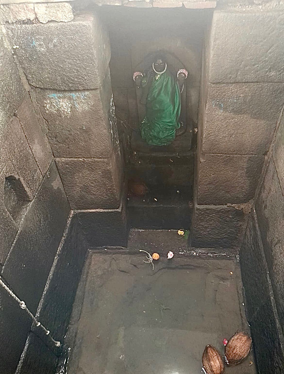 The actual source of the Godavari in the shrine. The tank is underground and just 5 ft x 4 ft. The image is that of Goddess Godavari. Notice the stream of water that is coming from beneath the statue and following over the steps into the tank.