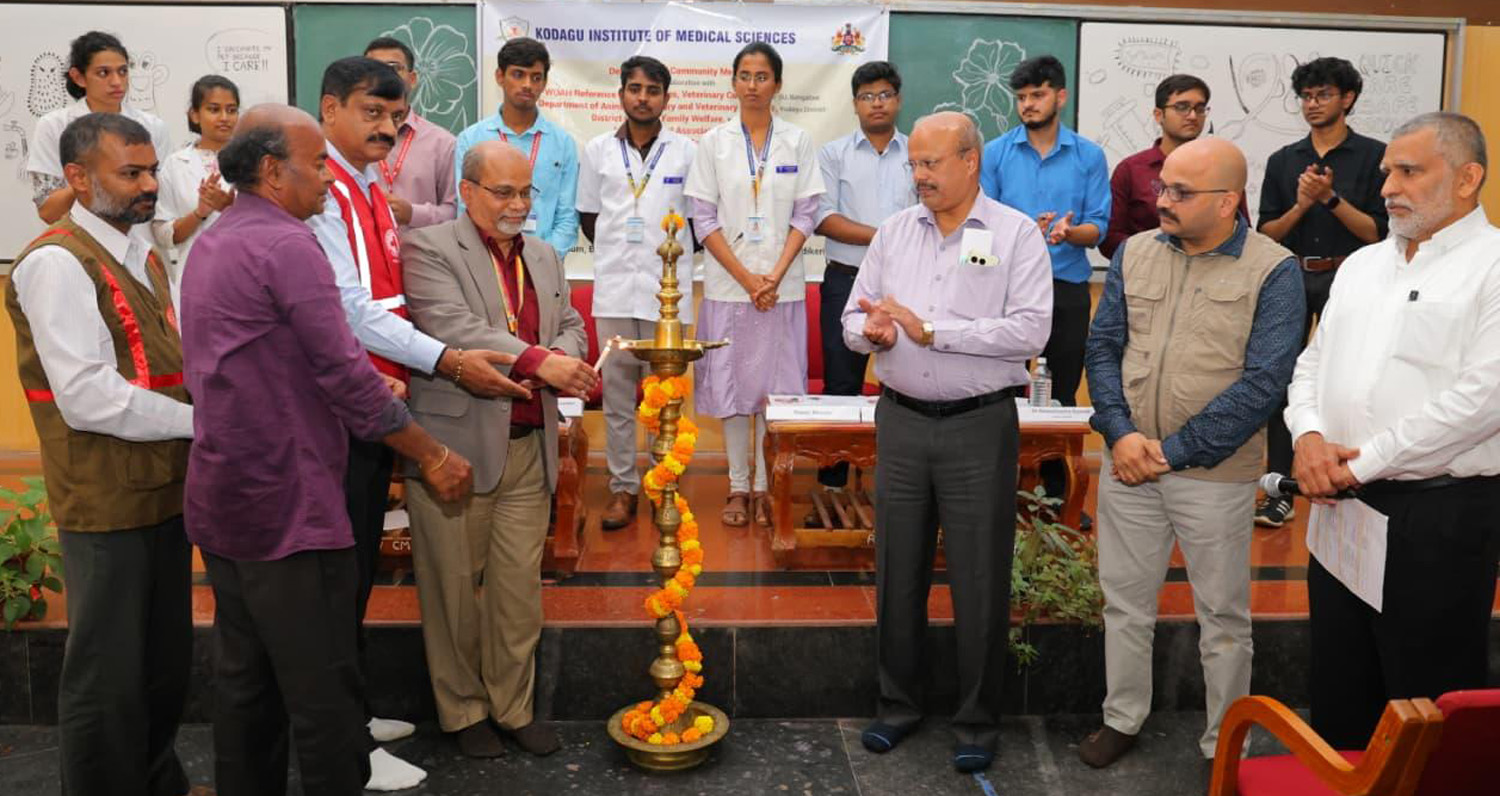 The programme was inaugurated by Veterinary Health Expert Dr. Srikrishna Ishlur, Dean and Director of Kodagu Institute of Medical Sciences Dr. Lokesh A. J., and District Health Officer Dr. Satish Kumar K. M. Professors and Heads of the Department of Community Medicine Dr. Ramachandra Kamath, Dr. Narasimha Rai, and Dr. Shivanna, along with Joint Directors of AHVS Dr. Shamappanna, IMA Kodagu representative Ravindra Rai, members of the Indian Red Cross, and other distinguished guests participated.