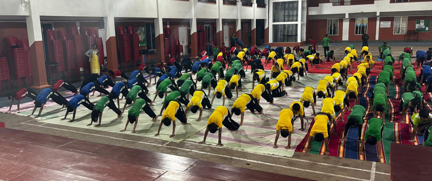 The celebrations began with an early morning yoga session from 6:00 a.m. to 7:15 a.m., conducted by Ashtanga yoga instructors  Lochana Bopanna and  Shivani Machaiah. More than 300 students actively participated, practising yoga asanas, pranayama and meditation. The instructors demonstrated various postures and emphasised the importance of regular yoga practice in enhancing concentration, discipline and overall well-being. Physical education teachers, wardens and staff members also took part in the session.