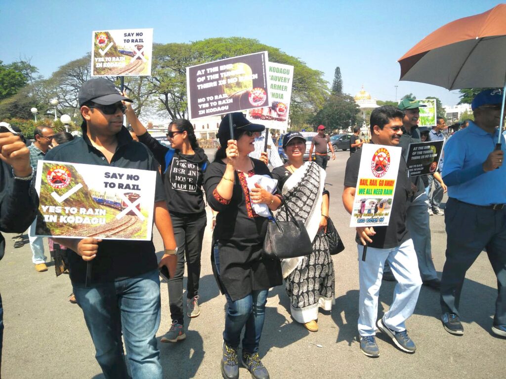There are many prominent personalities who were involved in the opposition to this project, but if I have to single out the voice of one self-effacing personality, Jammada Ganesh Aiyanna, an earnest and dedicated son of Kodagu from my village who relentlessly joins in causes that affect the present and future of issues affecting Kodagu…”February 18th 2018 will always be etched in my memory for long. That was the day we organised the massive KODAGU AGAINST RAILWAYS rally in Mysore exhibition grounds. A mammoth and unprecedented crowd of 15000 protestors from Kodagu, Bengaluru and Mysuru congregated in protest against the Railway project. Now to see this protest derailing the Railway line to Kodagu brings immense joy to me for being a small catalyst in ensuring destructive and mindless projects are stopped entering my beloved homeland Kodagu.”
